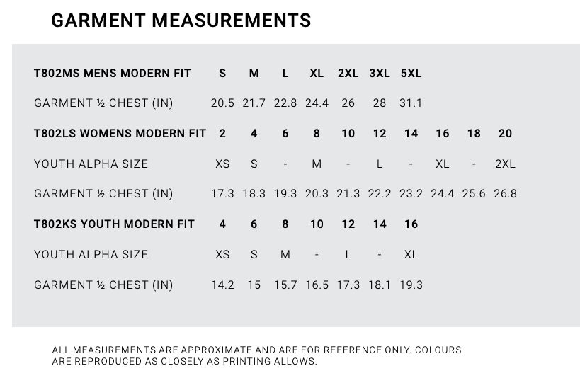 | Garment 1/2 Chest | 20.5 | 21.7 | 22.80 | 24.4 | 26 | 28 | 31.1 |
